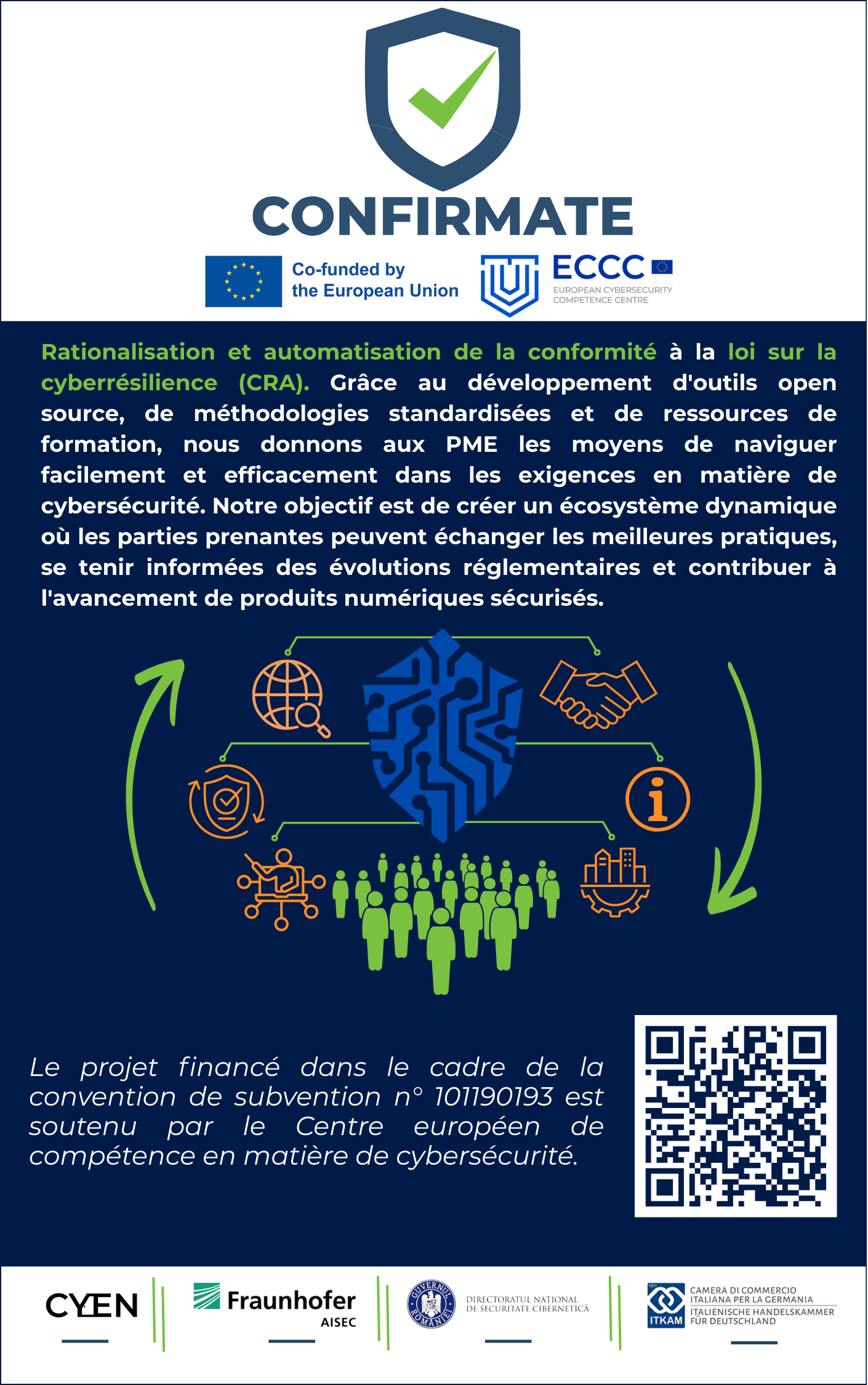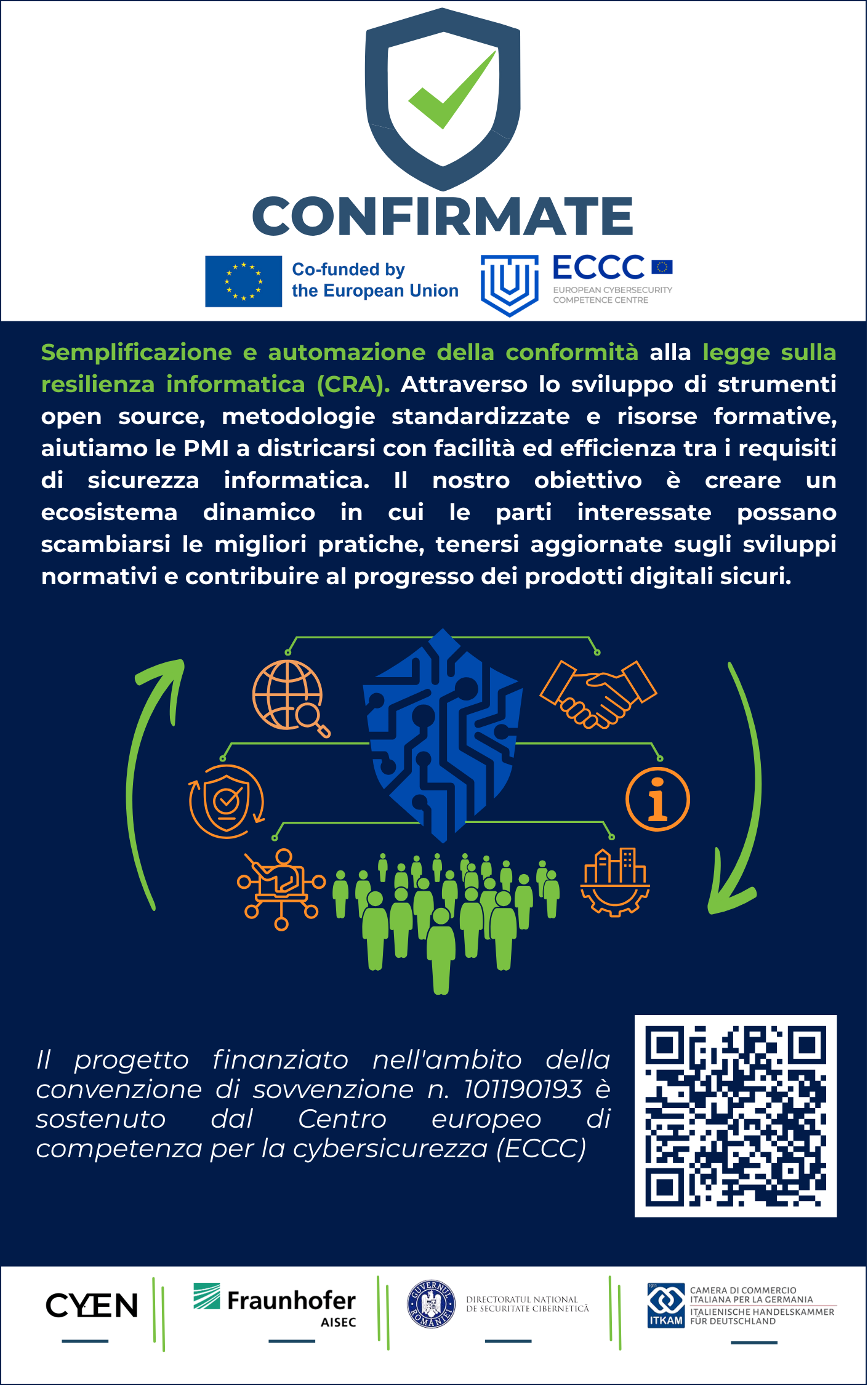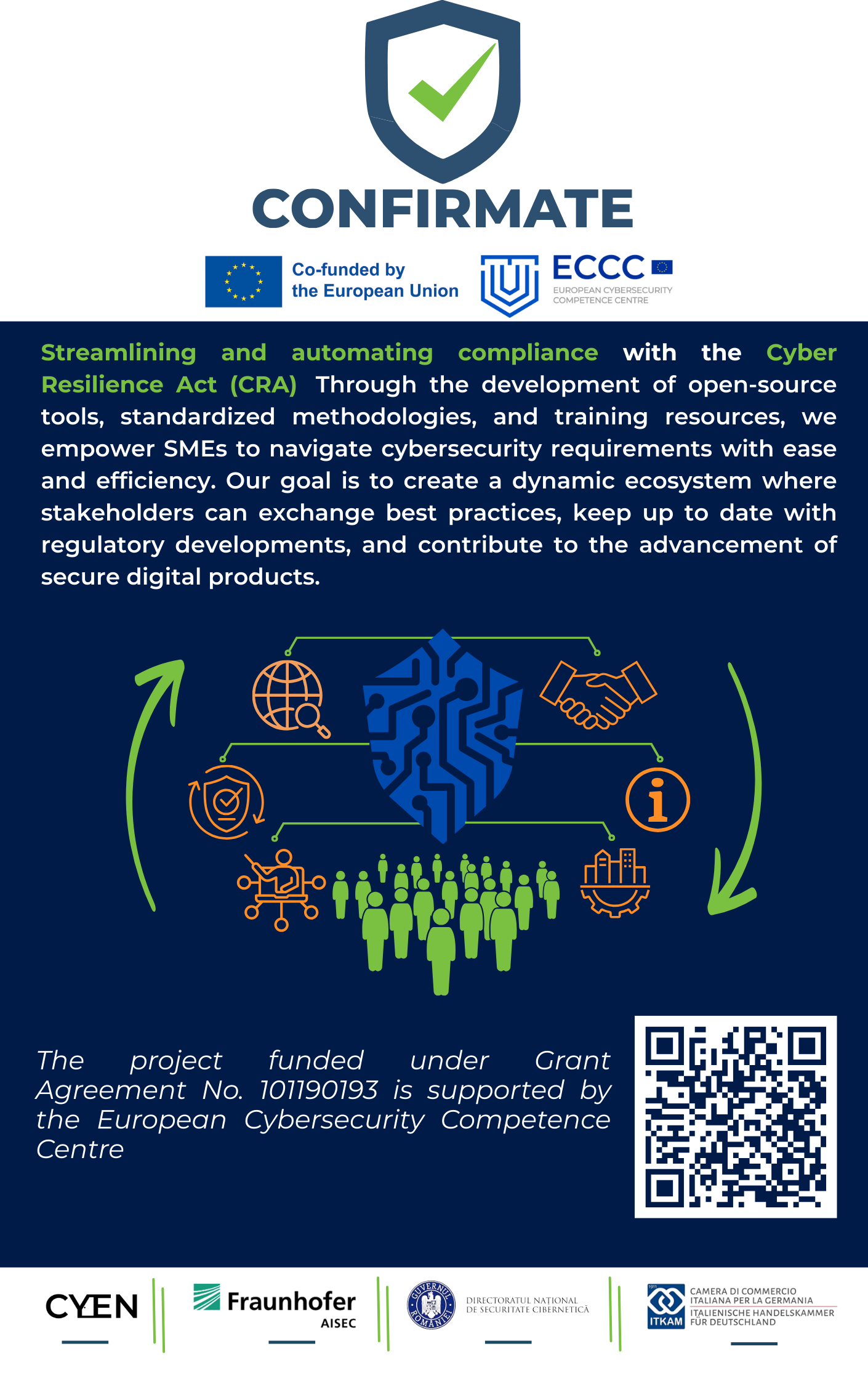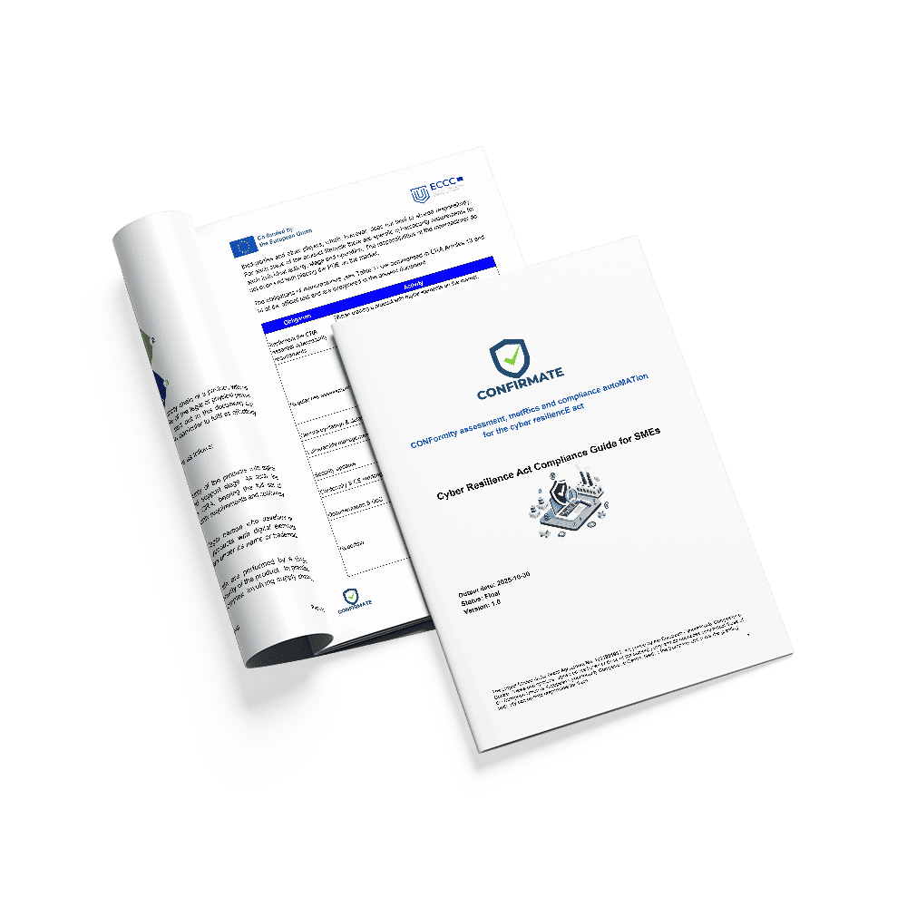 CONFIRMATE an European project* aimed at streamlining and automating compliance with the Cyber Resilience Act (CRA). Through the development of open-source tools, standardized methodologies, and training resources, we empower organizations to navigate cybersecurity requirements with ease and efficiency. Our goal is to create a dynamic ecosystem where stakeholders can exchange best practices, stay informed on regulatory developments, and contribute to the advancement of secure digital infrastructures. *The project funded under Grant Agreement No. 101190193 is supported by the European Cybersecurity Competence Centre. Views and opinions expressed are however those of the author(s) only and do not necessarily reflect those of the European Union or European Cybersecurity Competence Centre. Neither the European Union nor the granting authority can be held responsible for them
